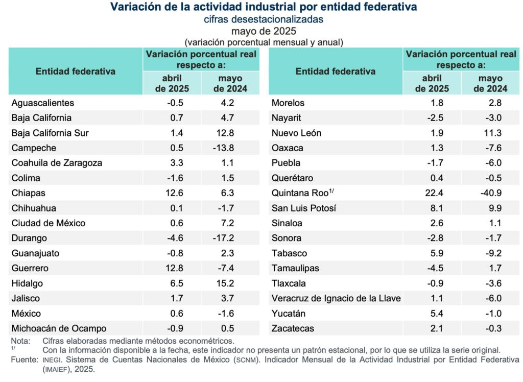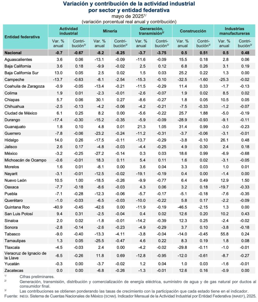 Por un lado y según el informe, a tasa anual y con cifras originales, en mayo de 2025 el sector Minería registró incrementos en Chiapas, Michoacán, Veracruz, Ciudad de México, Guanajuato, Baja California Sur y en Tlaxcala.