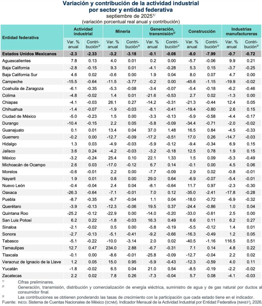En el desglose por sector, a tasa anual y con cifras originales, en septiembre de 2025 el sector Minería registró incrementos notables en Tamaulipas, Chiapas y Estado de México. Siguieron Veracruz,Guanajuato, Baja California, Zacatecas y Yucatán.