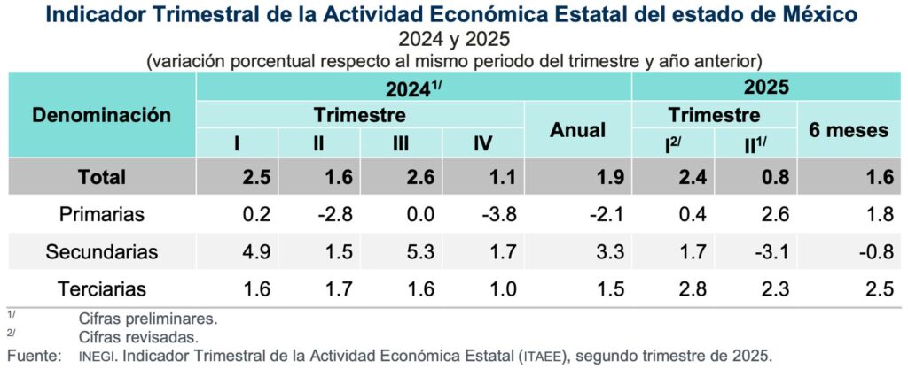 Conforme al reporte del instituto, en el Estado de México, durante el periodo enero a junio de 2025, el acumulado de la actividad económica estatal creció 1.6 por ciento, por el incremento en las actividades terciarias y primarias de 2.5 y 1.8 por ciento, respectivamente; por su parte, las secundarias disminuyeron 0.8 por ciento.
