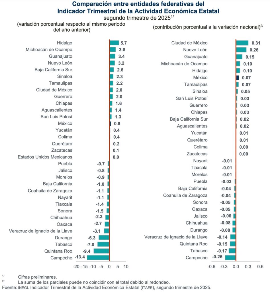 Por contra, comparado en segundo trimestre de este año con igual período del años pasado, los estados con las variaciones porcentuales más relevantes fueron Hidalgo, Michoacán, Guanajuato y Nuevo León, con 5.7, 3.8, 3.4 y 3.2 por ciento, en ese orden.