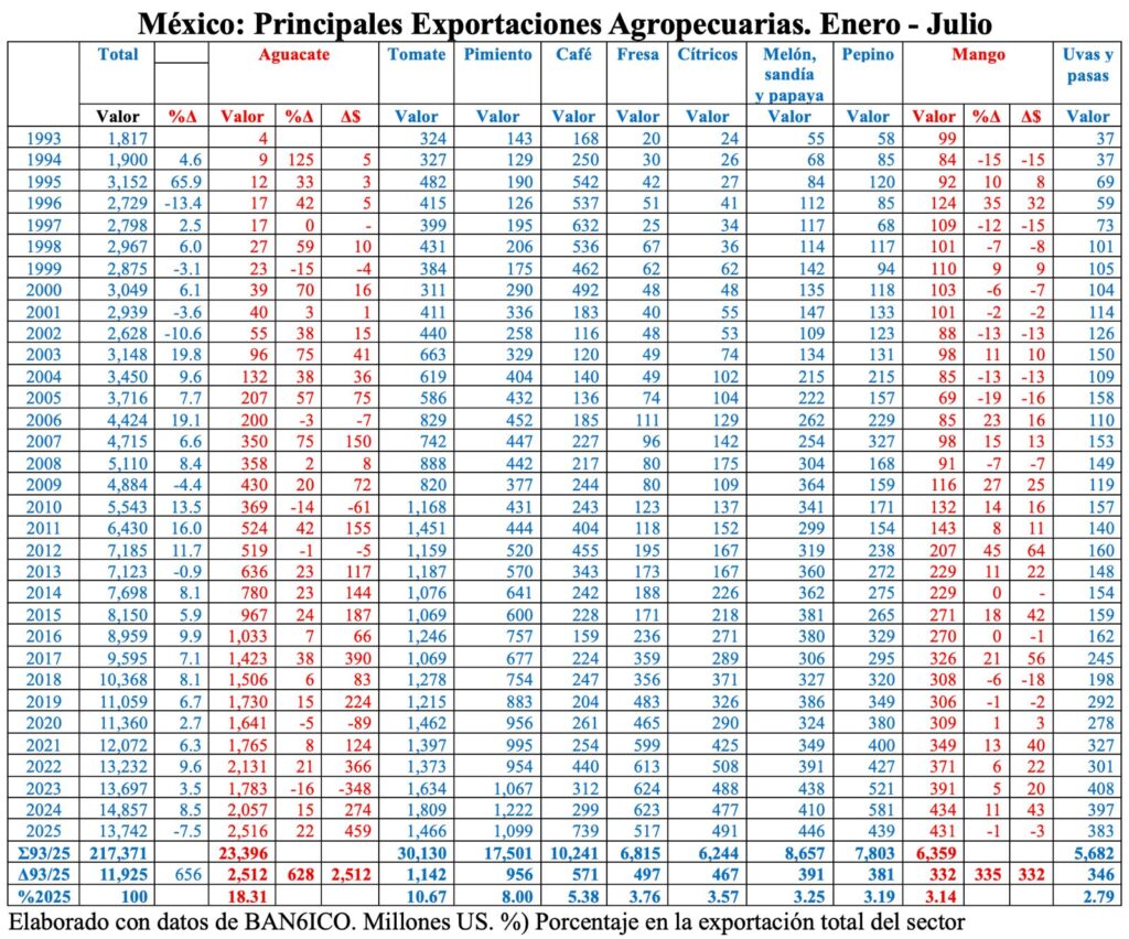 Así mismo constituyó el 18.31% del total de la exportación agropecuaria mexicana, en tanto que, en 2023 fue de 13.8% y en el año 1993, sólo representaba el 0.22%.