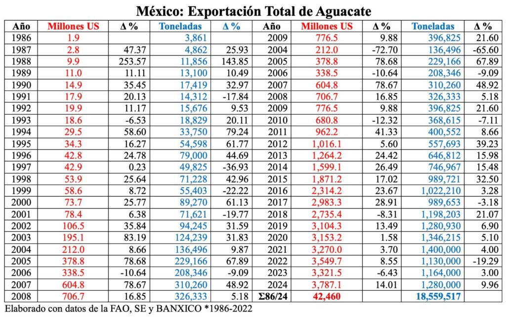 Como resultado de este proyecto, iniciado en 1987 y, en pleno desarrollo a partir de 1988, la exportación de aguacate ha registrado un crecimiento de 1,358%, pasando de 2.8 a 3,781 millones US en 2024.