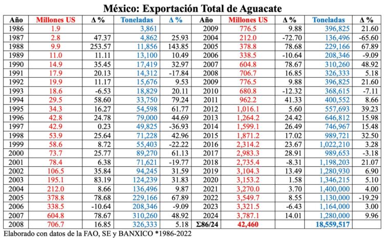 A partir de la implementación del proyecto, en el año de 1988, la exportación mexicana de aguacate ha acumulado una exportación total de 42,460 millones US.