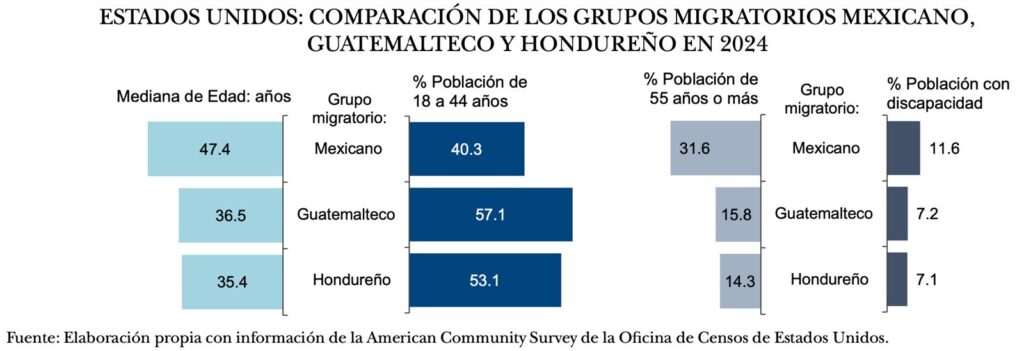 Según el análisis, “la mediana de edad del grupo migratorio mexicano en Estados Unidos se elevó de 35.1 años en 2007 a 41.4 años en 2015 y a 47.4 años en 2024, lo que implicó un incremento promedio anual de 0.7 años. Asimismo, se redujo el porcentaje de población en el rango de edad de mayor presencia en el mercado laboral y el de mayor intensidad de envío de remesas. También se incrementó el porcentaje de población con 55 años o más de 12% en 2007, a 20.1% en 2025 y a 31.6% en 2024. En dicho grupo migratorio el porcentaje que presentaba alguna discapacidad pasó de 7.6% en 2007 a 8.7% en 2015 y a 11.6% en 2024.