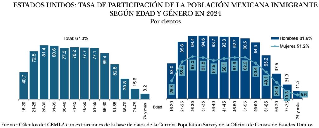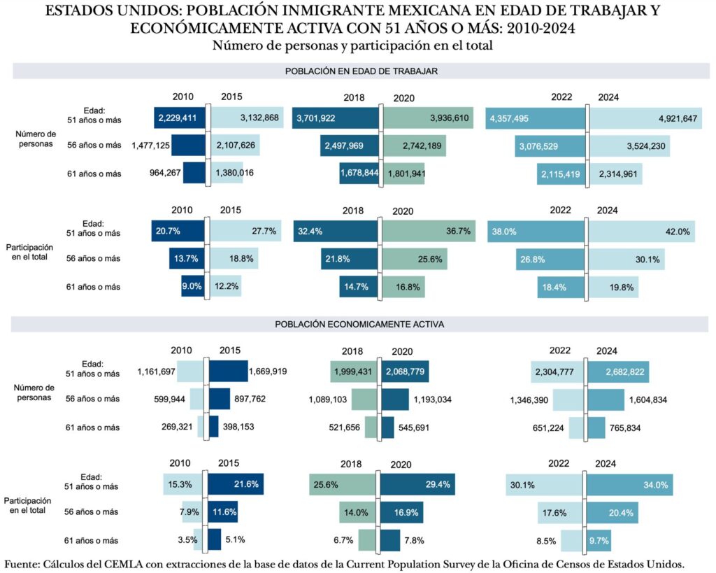 “Un aspecto importante es que, ante la ausencia de migración mexicana neta positiva, ha ido aumentando el número absoluto y la participación en la población en edad de trabajar y en la económicamente activa del segmento con edades que implican menores tasas de participación laboral. El porcentaje en la población mexicana inmigrante con 56 años o más se elevó respecto a la población en edad de trabajar de 13.7% en 2010, a 18.8% en 2015, a 25.6% en 2020 y 30.1% en 2024. Por su parte, en la población económicamente activa la participación de dicho segmento poblacional pasó de 7.9% en 2010 a 11.6% en 2015, 16.9% en 2020 y 20.4% en 2024. Además, hay que reconocer que en el ciclo de vida laboral las remuneraciones medias decrecen a partir de ciertas edades”, se anotó en el documento.