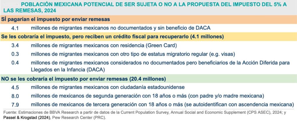 Lo anterior, de acuerdo con un análisis de la empresa BBVA Research, firmada por Juan José Li Ng y Carlos Serrano, respecto de la iniciativa para gravar 5 por ciento las remesas, que avanzó en el Congreso estadounidense.