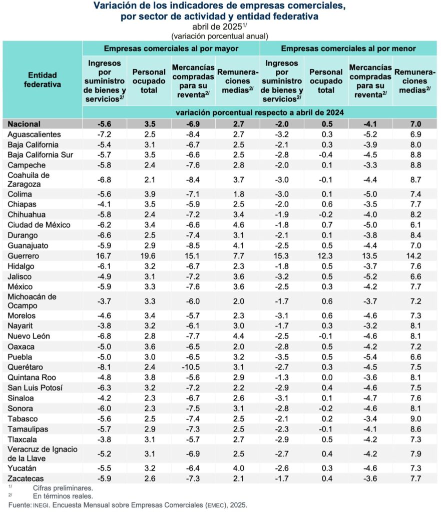 Valle de México, as 25 de junio del 2025.- El comercio al por mayor en el Estado de México continuó con su racha negativa en cuanto a ingresos por suministro de bienes y servicios y en el mes de abril reportó menos 5.9 por ciento, mientras que el comercio al menudeo permaneció con altibajos y en ese mes registró menos 2.5 por ciento luego de que en el mes previo creció 4.3 por ciento.