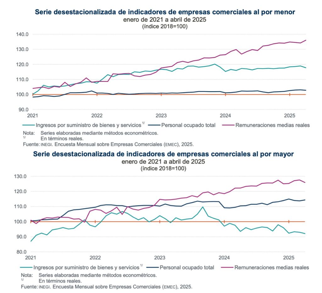 El INEGI dio a conocer los resultados de la Encuesta Mensual sobre Empresas Comerciales, donde comportamiento del comercio en el país, a tasa mensual y con datos desestacionalizados, es decir, ya eliminados los efectos estacionales y el calendario, los ingresos reales por suministro de bienes y servicios (monto que se obtuvo por todas aquellas actividades de