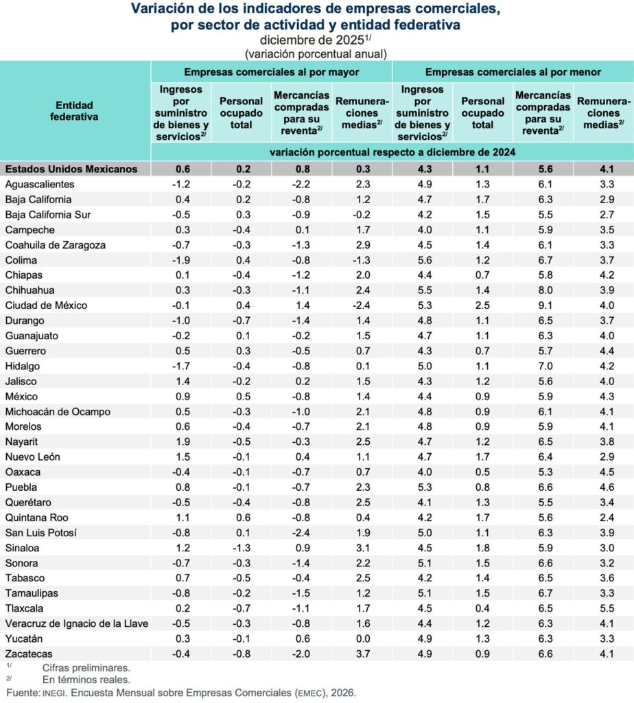 INEGI reportó que en diciembre de 2025, a tasa mensual y con datos desestacionalizados, los ingresos reales por suministro de bienes y servicios (monto que se obtuvo por todas aquellas actividades de producción, comercialización o prestación de servicios) de las empresas comerciales al por mayor descendieron 0.8 por ciento. El personal ocupado total aumentó 0.6 por ciento y las remuneraciones medias reales no presentaron variación.