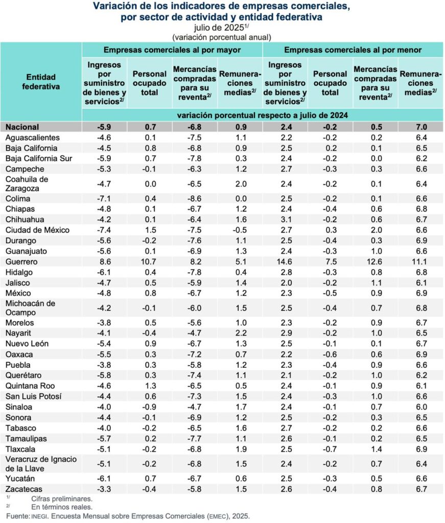 Por un lado, a nivel nacional aumentaron 3.0 por ciento los ingresos por suministro de bienes y servicios del comercio al por mayor y 0.1 por ciento, los del comercio al por menor, esto en julio de 2025, a tasa mensual.