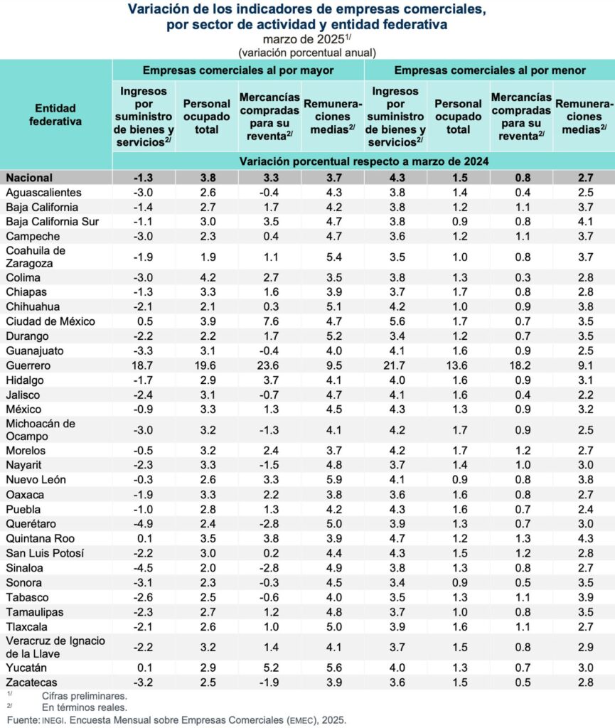 El INEGI dio a conocer los resultados de la Encuesta Mensual sobre Empresas Comerciales (EMEC) correspondientes al mes de marzo, en los cuales las ventas minoristas reportaron crecimientos en todas las entidades, en forma muy significativa el caso de Guerrero (21.7 por ciento).