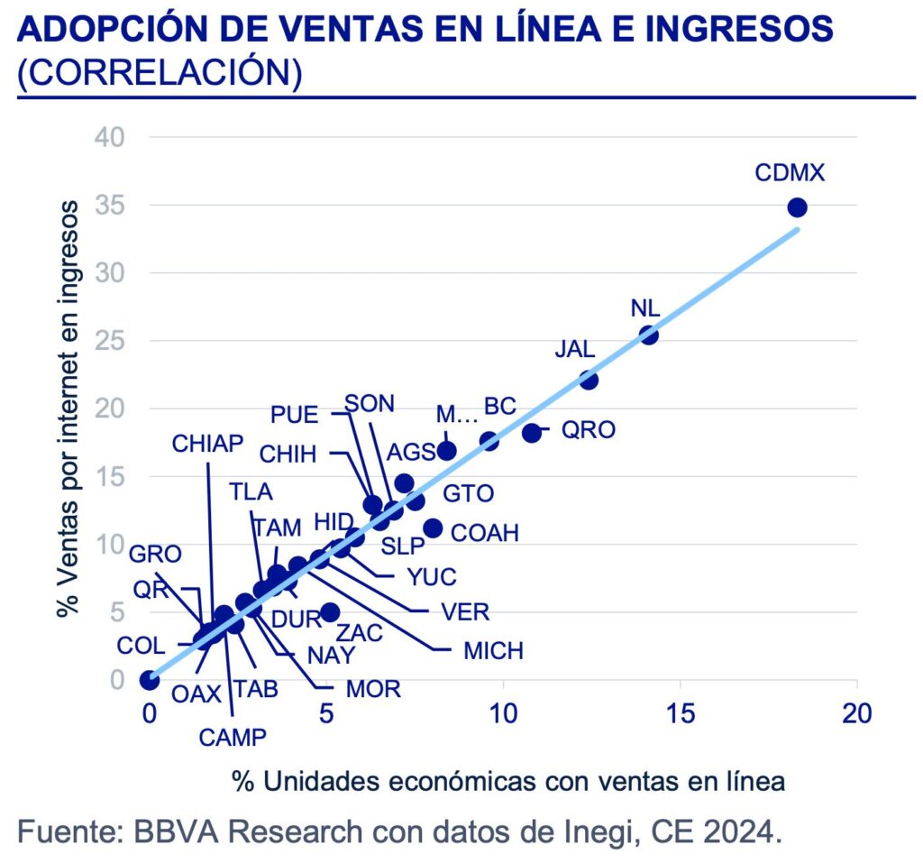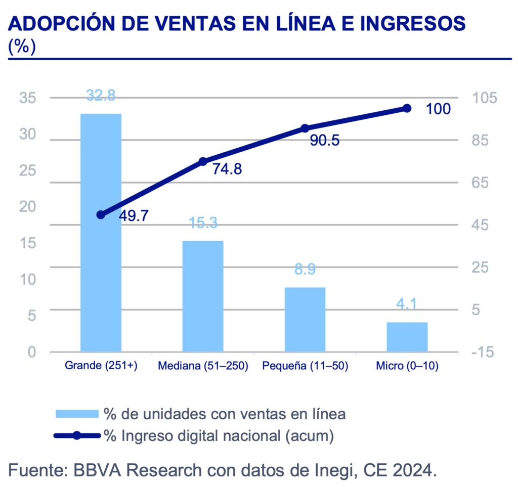 Asimismo, refirió que Al profundizar en los canales predominantes para realizar estas ventas en línea, identificamos patrones divergentes: mientras el norte y centro del país (encabezados por CDMX, Nuevo León y Querétaro) utilizan páginas web propias y plataformas estructuradas, el sur-sureste depende de redes sociales como principal canal de venta, reflejando un modelo de digitalización informal, móvil y de bajo costo. Mientras solo 4 por ciento de las microempresas venden en línea, las grandes superan el 30 por ciento, y concentran casi la mitad de los ingresos digitales nacionales. Esto da soporte a la hipótesis de que el grado de formalización digital crece con la infraestructura, el tamaño empresarial y el acceso financiero, dejando al sur con un modelo más informal, flexible, pero de menor escala y valor agregado.