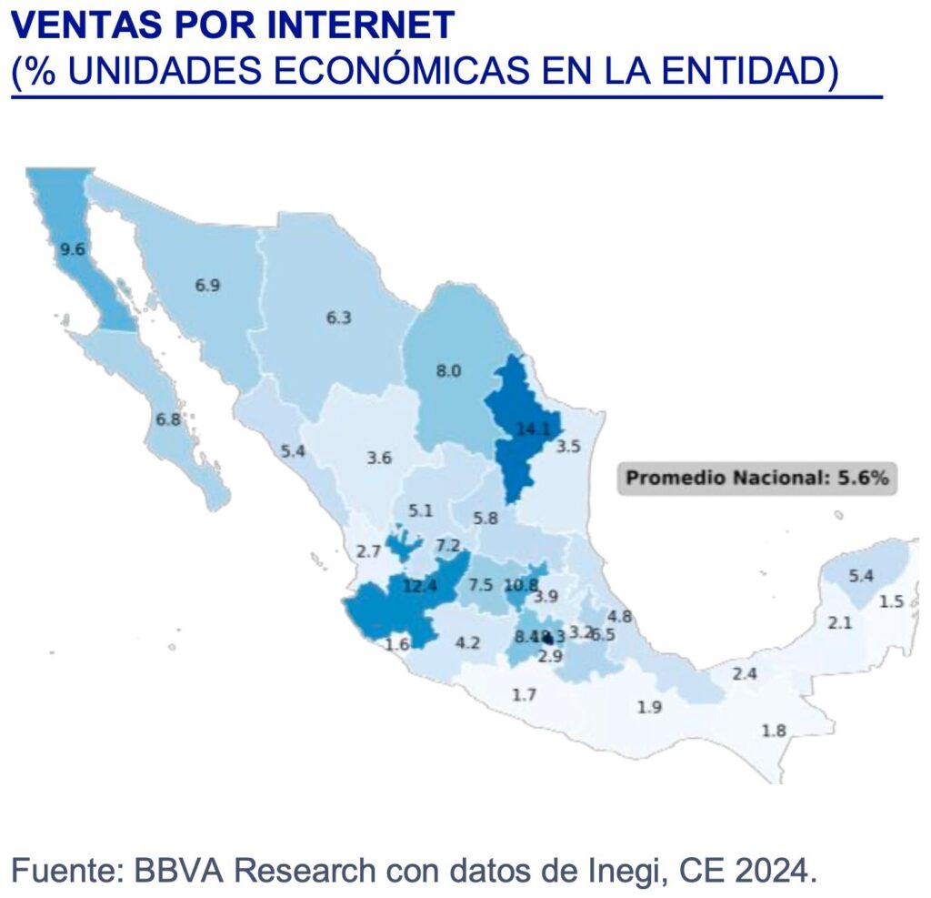 “El comercio digital en México no es todavía un fenómeno masivo, pero sí altamente transformador. Las entidades con mayor sofisticación digital ya experimentan ganancias e ingresos, mientras las regiones rezagadas enfrentan el riesgo de un nuevo tipo de desigualdad: la brecha digital empresarial”, difundió la firma BBVA en su análisis sobre la “Situación Sectorial Regional de México, en el cual se resaltó, entre otras cosas, que el desempeño regional en 2025 mantiene un patrón de crecimiento asimétrico entre estados impulsados por el sector de servicios (CDMX 1.8 por ciento, BCS 1.3 por ciento), mientras que, Tabasco (-4.3 por ciento) y Campeche (-3.2 por ciento) ya resentía la salida de obra civil; hacia 2025 el motor será el sector servicios como turismo y comercio minorista y mayorista, que amortigua la debilidad industrial y sostiene el crecimiento nacional.