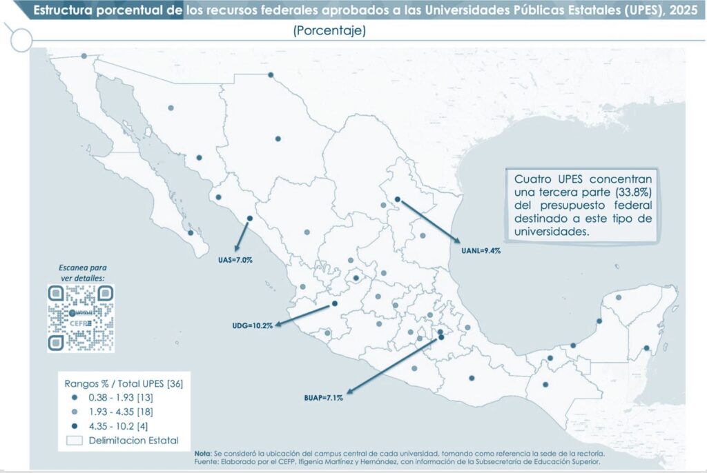 El Centro de Estudios de las Finanzas Públicas “Ifigenia Martínez y Hernández” (CEFP-IMyH), difundió la distribución de los recursos federales aprobados para las universidades públicas estatales (UPES) para este año, donde las mencionadas universidades habrán recibido, en conjunto y al final del año, 25 mil 257 millones 300 mil pesos.