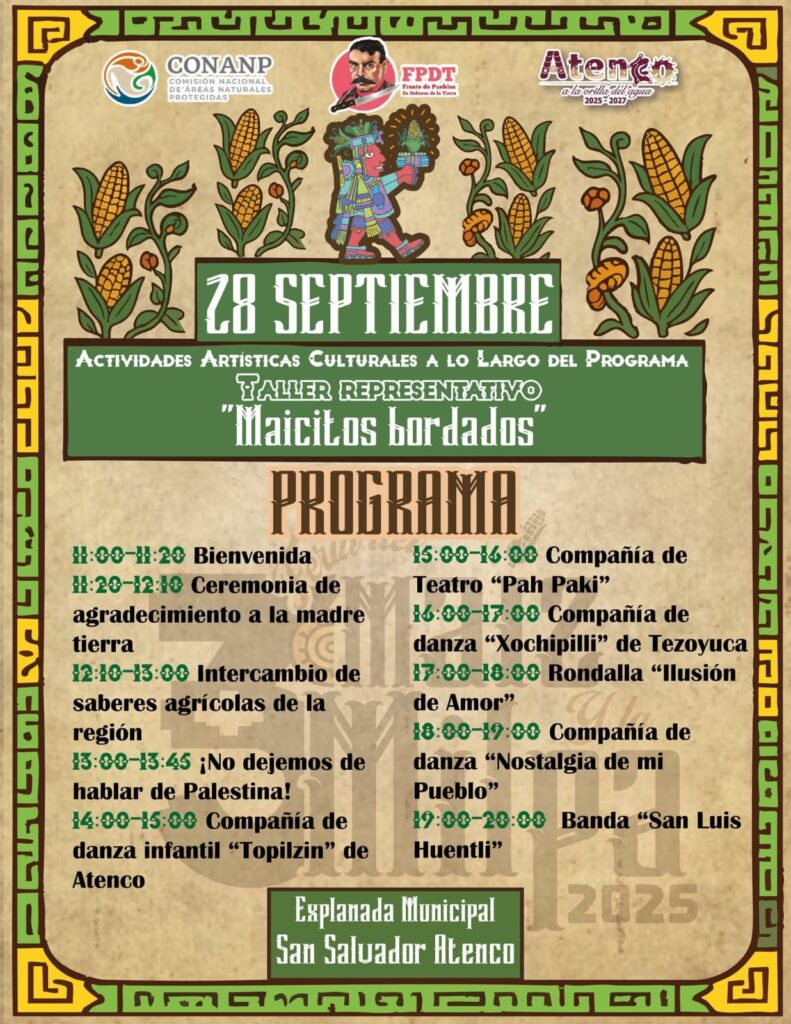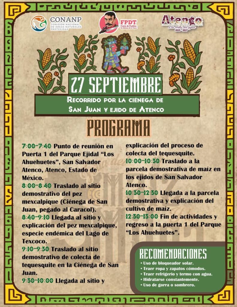 San Salvador Atenco realizará los días 27 y 28 de septiembre la Feria del Maíz y la Milpa con un programa de actividades que incluye un interesante recorrido por la Ciénega de San Juan y Ejido de Atenco y actividades artísticas culturales como taller representativo Maicitos Bordados.