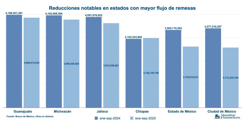 En el estudio se refirió que los estados del país que sobresalen por sus reducidos porcentajes de hogares beneficiarios de remesas son Yucatán y Chihuahua en que solo uno de cada 20 hogares las recibe, así como la Ciudad de México donde uno de cada 25 hogares es receptor y el Estado de México en que uno de cada 29 hogares es beneficiario.
