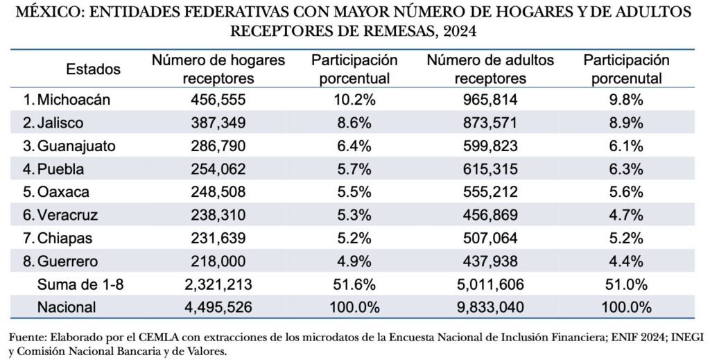 El 11.3 por ciento de los hogares del país son receptores de remesas, es decir, uno de cada 8.8 hogares, pero en el estado de Michoacán el 31.8 % de los hogares se benefician de esos recursos provenientes del exterior, es decir, 1 de cada tres hogares. En los estados de Durango, Guerrero, Nayarit, Oaxaca y Zacatecas, prácticamente, uno de cada 5 hogares es receptor de remesas.