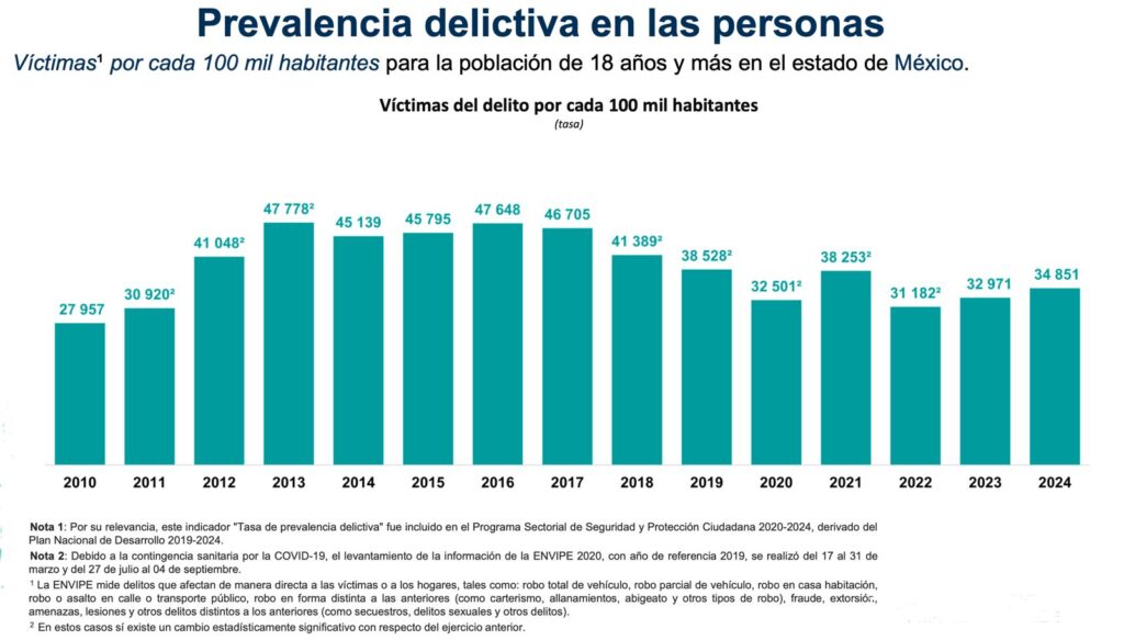 Valle de México, a 18 de septiembre del 2025.- El Estado de México encabezó las relación de entidades con las mayores tasas de prevalencia delictiva por cada 100 mil habitantes durante el 2024, con 2 millones 102 mil 545 hogares víctima, es decir, que 42 por ciento de los hogares en la entidad, estimados en 5 millones 7 mil 398, hubo al menos una persona víctima de algún hecho delictivo.