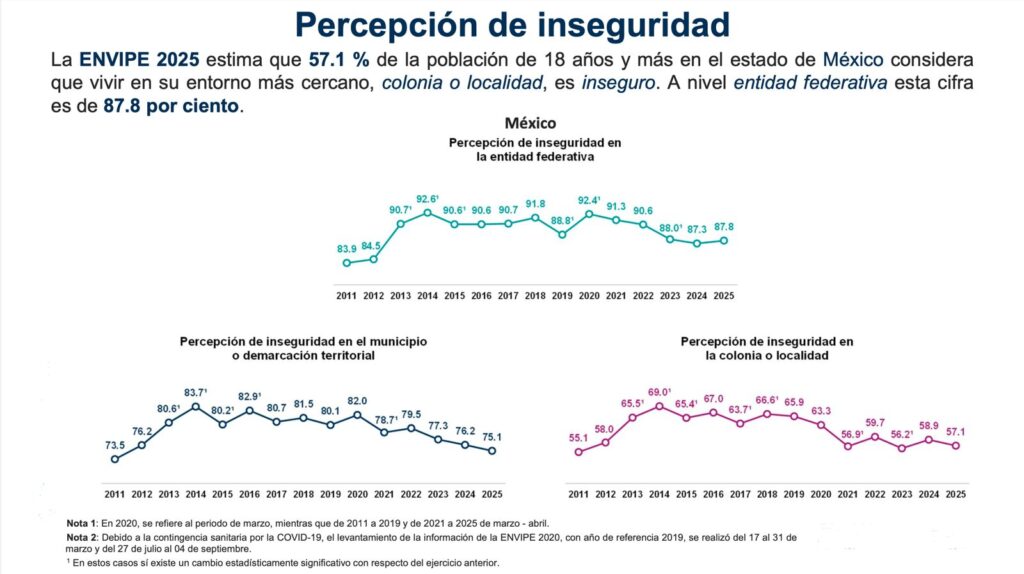 Además, se estimó que 57.1 por ciento de la población de 18 años y más en el Estado de México consideró que vivir en su entorno más cercano, colonia o localidad, es inseguro. A nivel entidad federativa esta cifra es de 87.8 por ciento, una de las más altas del país.