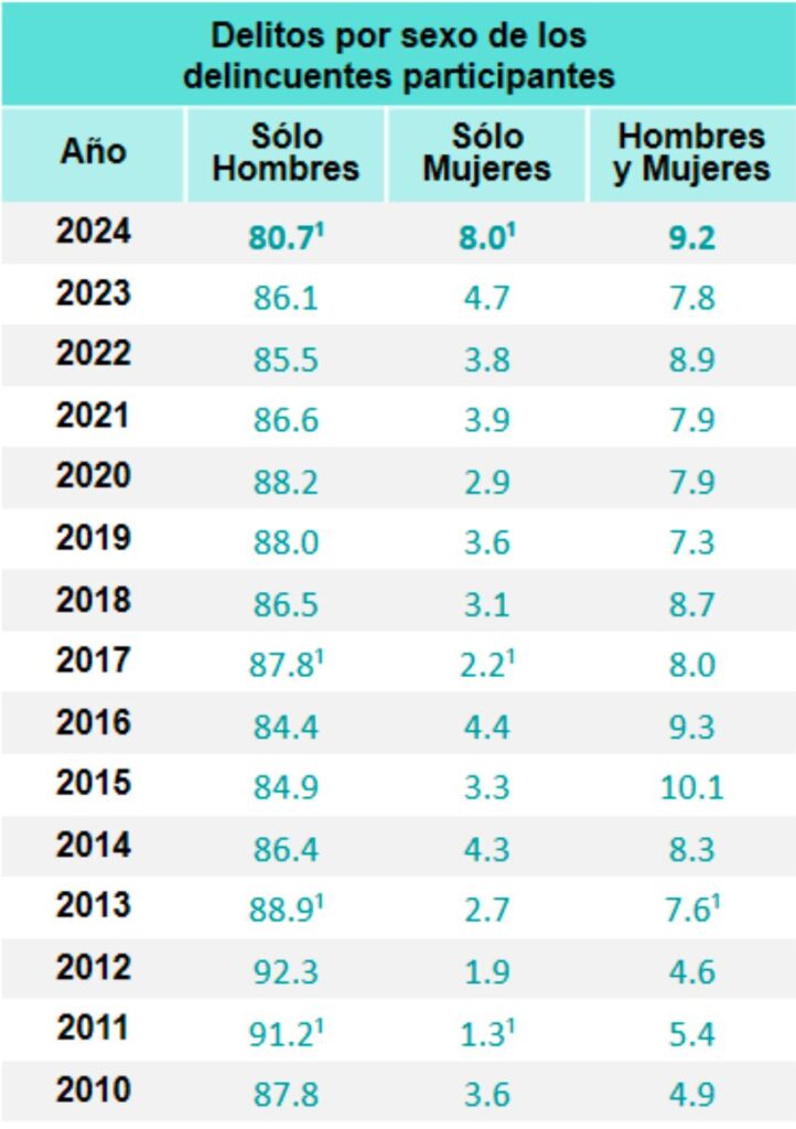 Las mujeres fueron las más vulneradas en cuanto a delitos sexuales, con una tasa de incidencia de 4 mil 160 delitos por cada 100 mil. Lo anterior fue estadísticamente similar a los 4 mil 290 delitos estimados en 2023. Entre hombres, la tasa para este tipo de delitos fue de 546 por cada 100 mil. Se contabilizaron ocho delitos sexuales contra mujeres por cada delito sexual contra hombres.