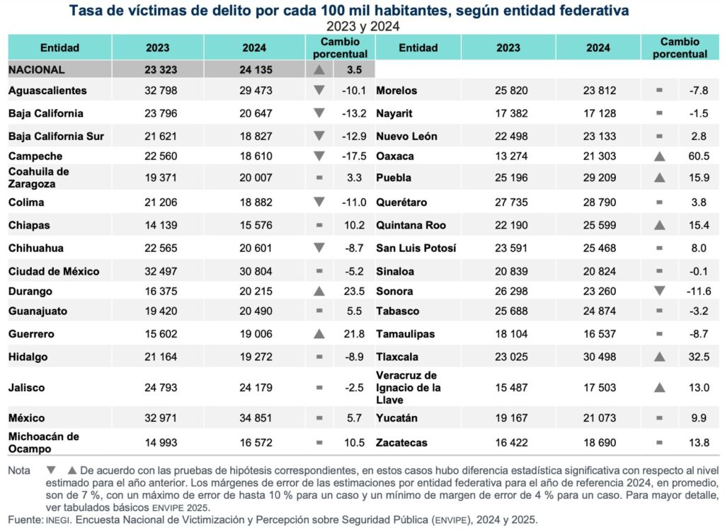 En 2024, el INEGI estimó que en 11.4 millones de hogares (29.0 % del total del país), al menos una o un integrante fue víctima del delito. Este porcentaje fue superior al de 2023.