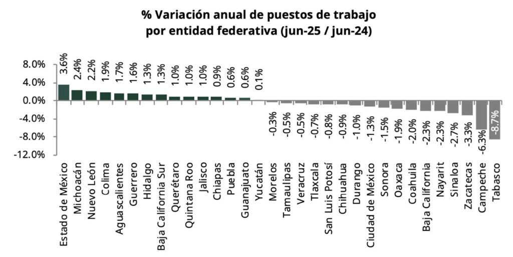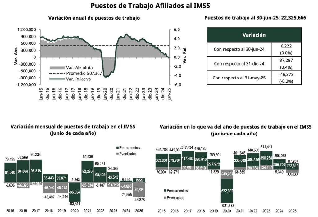 Por otra parte, el instituto difundió que al 30 de junio de 2025 se registraron 22 millones 325 mil 666 puestos de trabajo, de los cuales 87.5 por ciento son permanentes (la mayor proporción de los últimos 16 años en períodos iguales) y 12.5 por ciento son eventuales.