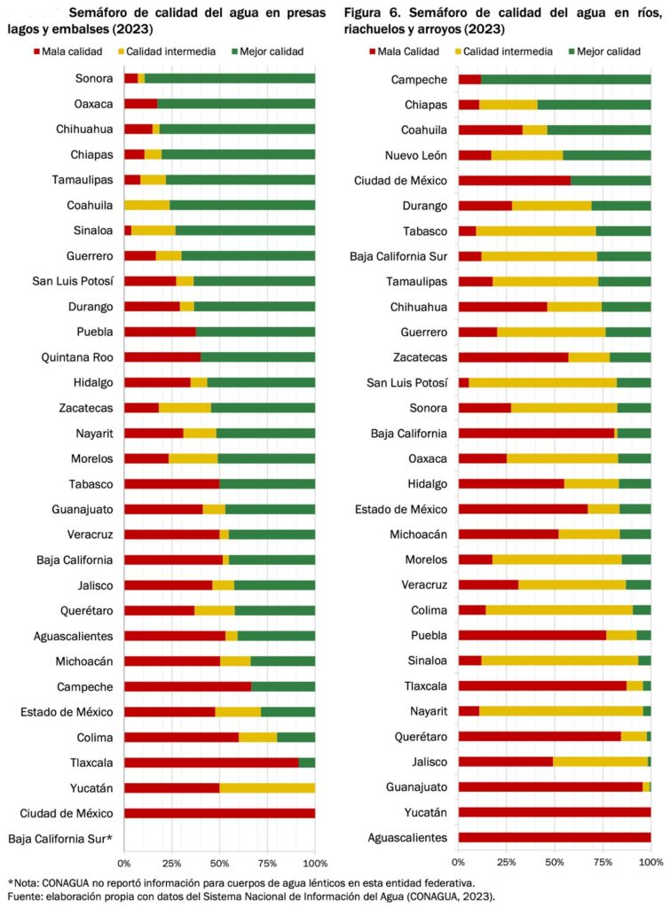 “En trece entidades el semáforo de calidad del agua en presas, lagos y embalses en menos del 50 por ciento de los cuerpos de agua indica la mejor calidad. En Tlaxcala y Ciudad de México, la gran mayoría tiene mala calidad, 91.3% y 100% respectivamente (CONAGUA, 2023)”, según el análisis.