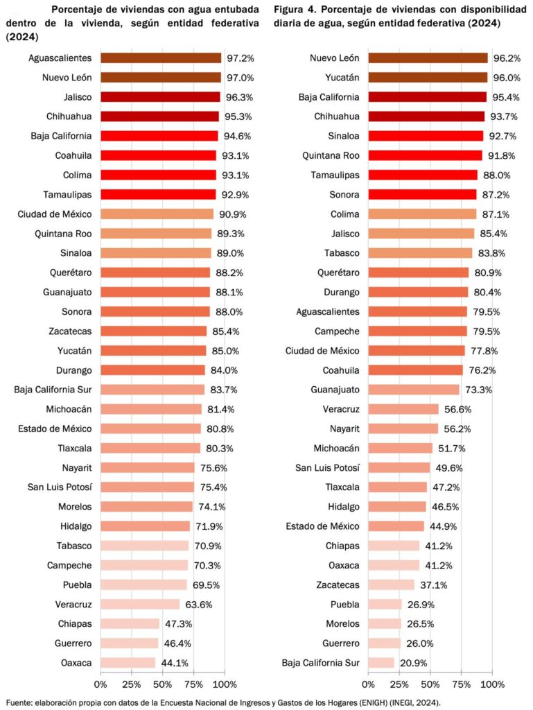 En el análisis, además del tema jurídico, se estableció que a nivel nacional “La situación actual para garantizar el derecho humano en México presenta retos importantes, ya que, aunque la mayoría de la población cuenta con agua entubada dentro de la vivienda (80.7 por ciento), el suministro diario ha venido disminuyendo: de 72.0.0 por ciento en el 2016 a 65.5 por ciento en el 2024.