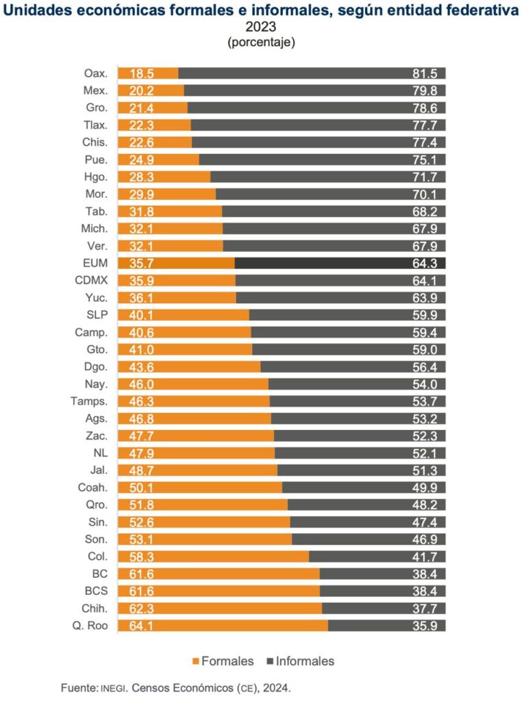 Porcentualmente, el Estado de México sólo fue superado por Oaxaca (81.5 por ciento) en materia de unidades económicas informales que aumentaron de 79.4 por ciento a 79.8 por ciento del 2018 al 2023 (a nivel nacional, en el mismo período se pasó de 62.6 por ciento a 64.3 por ciento).