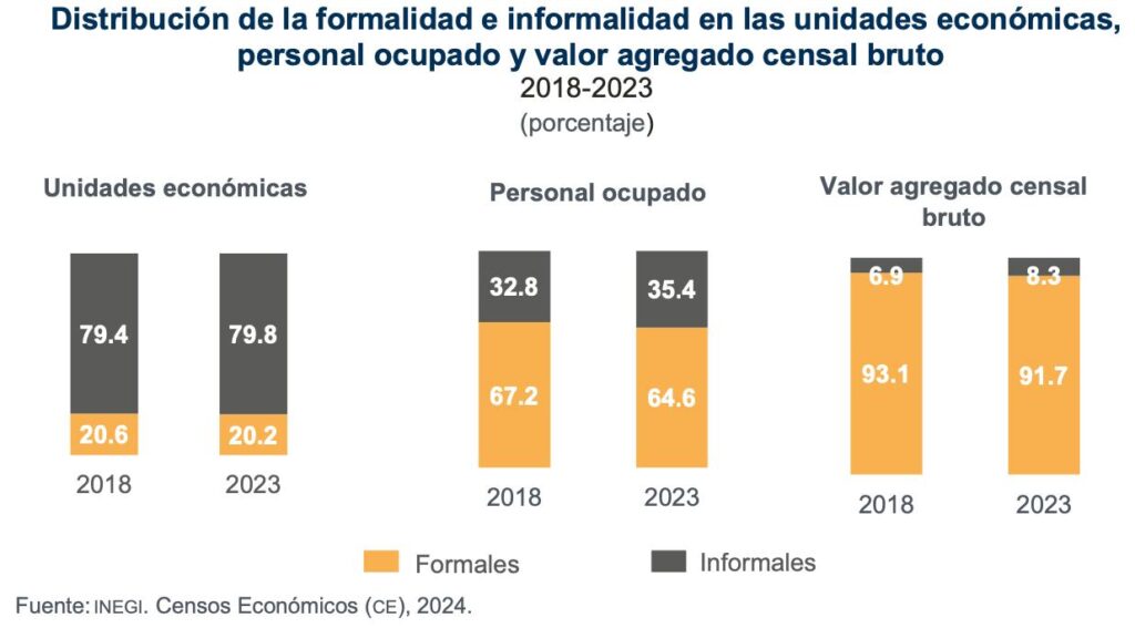 Así, la participación de las unidades económicas formales disminuyó de 20.6 % en 2018 a 20.2 por ciento en 2023. En contraste, las informales aumentaron de 79.4 a 79.8 por ciento en ese periodo. El personal ocupado en unidades formales bajó 3 puntos porcentuales: pasó de 67.2 a 64.6 por ciento. En 2023, 91.7 por ciento del valor agregado censal bruto correspondió a unidades formales y 8.3 por ciento, a informales