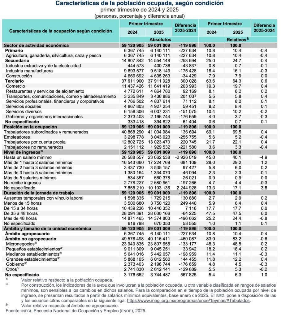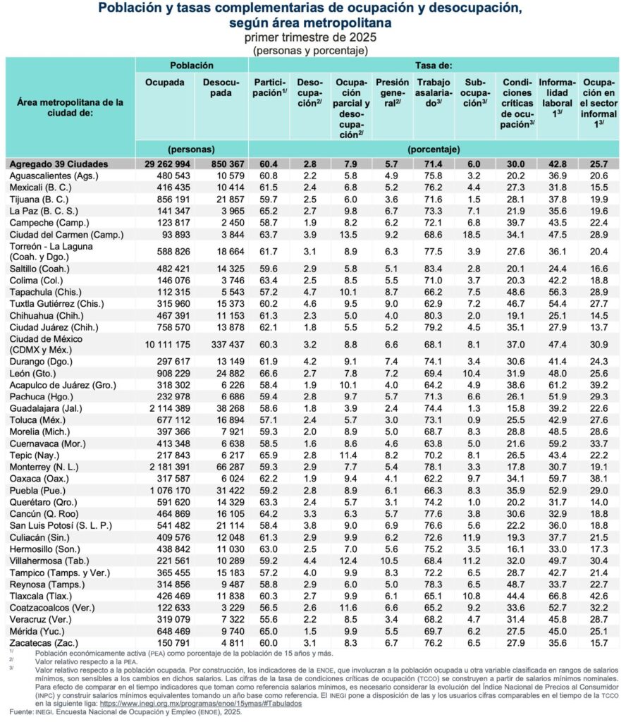 Por otra parte y conforme al reporte del INEGI, a nivel nacional en el primer trimestre de 2025 la población desocupada ascendió a 1.49 millones de personas, cifra menor a la registrada en el mismo periodo de 2024, con 1.54 millones de personas.
