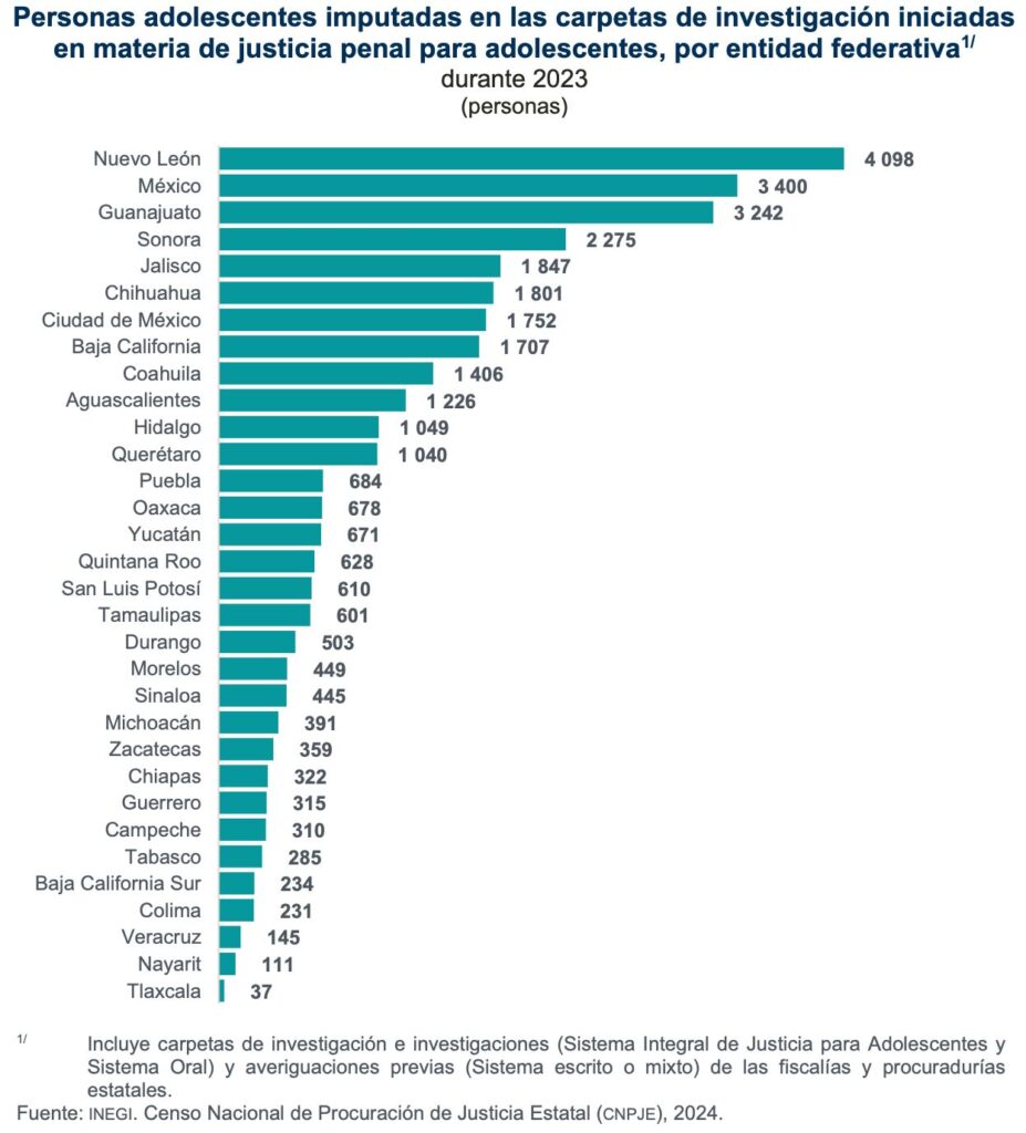 El instituto detalló que seis entidades concentraron el 50.7 por ciento de las 32 mil 852 personas adolescentes registradas como imputadas en carpetas de investigación, encabezando la lista Nuevo León, con 4 mil 98; Estado de México, 3 mil 400; Guanajuato, 3 mil 242: Sonora, 2 mil 275; Jalisco, mil 847 y Chihuahua, mil 801.