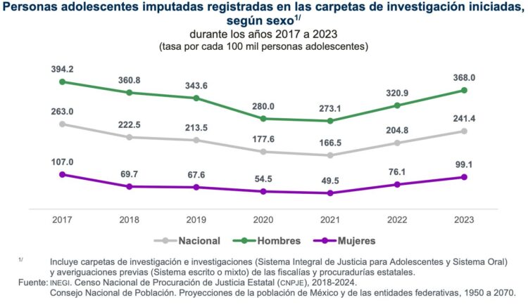 No obstante, de 2021 a 2023 hubo un aumento de 45 por ciento (de 22 mil 654 a 32 mil 852), y durante el 2023, ocho de cada 10 adolescentes imputados por la presunta comisión de un delito fueron hombres.