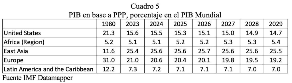 En el cuadro 5 podemos ver el peso relativo que han tenido y que tendrán en el futuro diversas regiones económicas del mundo y, específicamente, los Estados Unidos, según estimaciones del FMI, utilizando el Poder de Compra (PPP, por sus siglas en inglés), para el año de 1980 y proyecciones a 2029