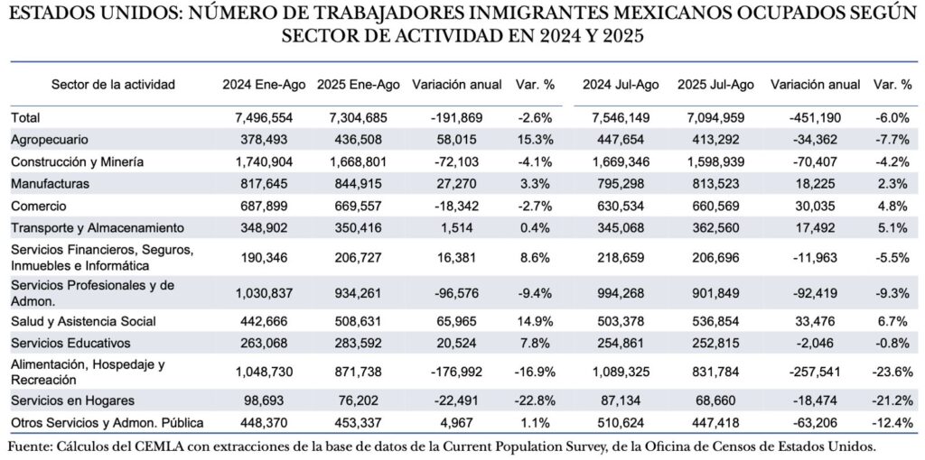 En el bimestre julio-agosto de 2025, el principal sector empleador fue la construcción con 1,598,939 personas y el 22.5% del total, seguido por los sectores de servicios profesionales y de administración; alimentación, hospedaje y recreación y las manufacturas. En su conjunto esos cuatro sectores emplearon 4,146,095 trabajadores mexicanos inmigrantes, el 58.4 por ciento del total.