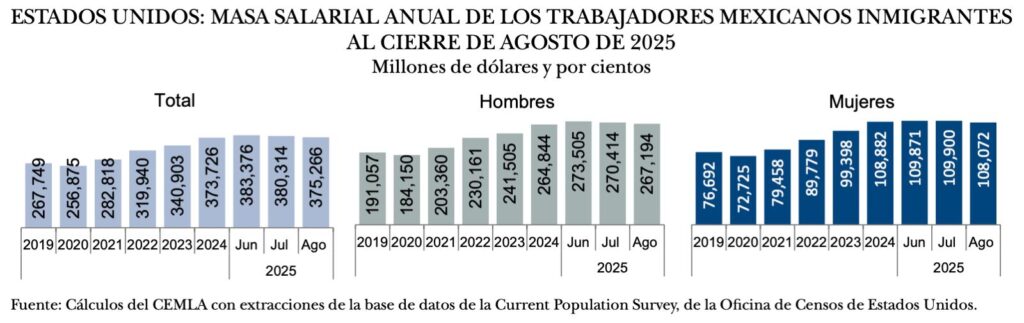 Respecto de las remuneraciones, el Cemla informó que en agosto de 2025, la remuneración media anual del conjunto de trabajadores mexicanos inmigrantes fue de 50 mil 575 dólares (4 mil 215 dólares mensuales), cifra menor a la alcanzada en junio de ese año con 51 mil 128 dólares. En agosto la remuneración resultó de 56 mil 256 dólares anuales en los trabajadores mexicanos de género masculino (4 mil 688 dólares mensuales) y de 40 mil 557 dólares en las mujeres (3 mil 380 dólares mensuales).