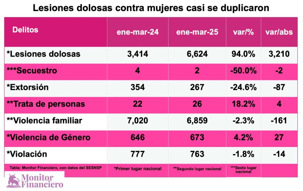 También se dio una ligera disminución en el delito de violación, pero la cifra sigue siendo alta: 763 en enero-marzo de este año contra 777 del mismo lapso del 2024.