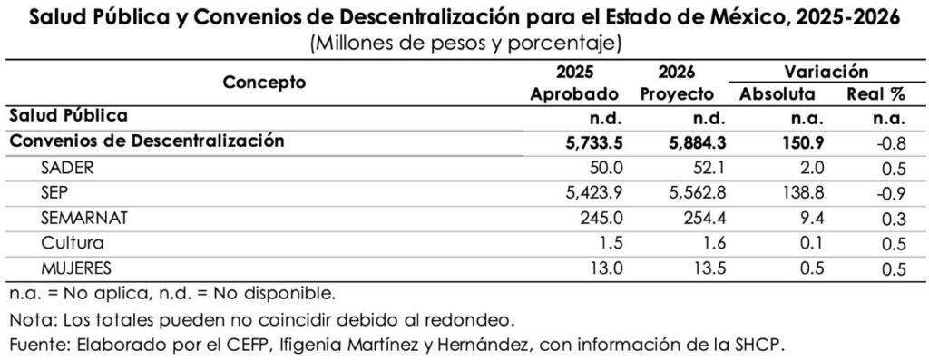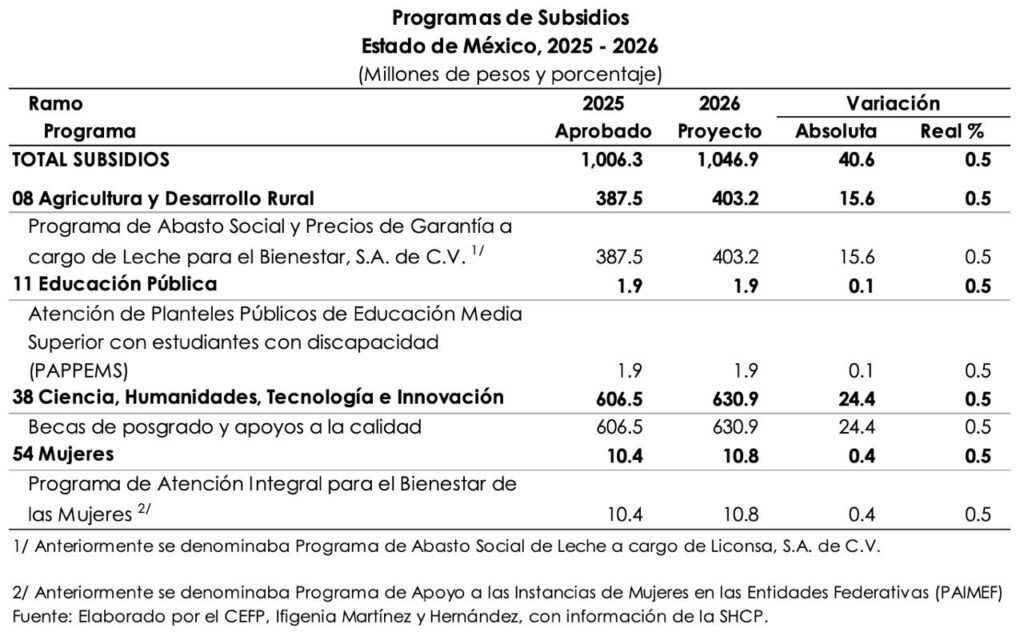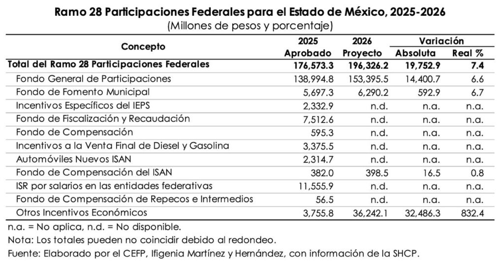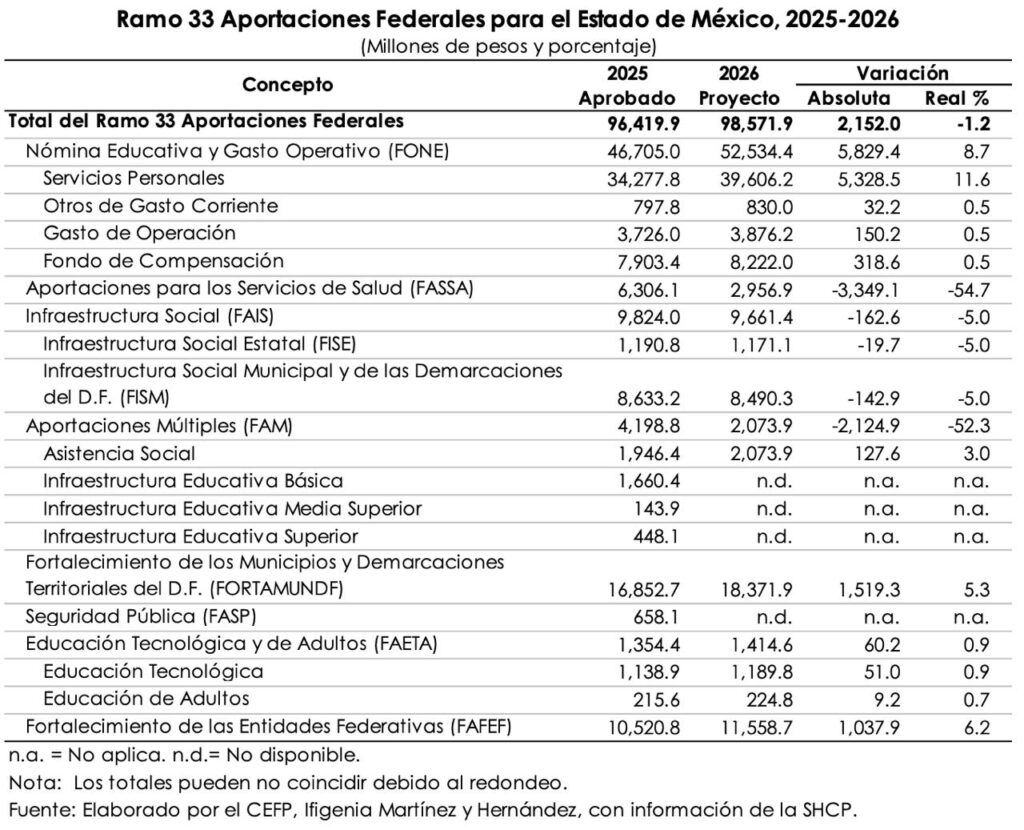 Un análisis realizado por el Centro de Estudios de las Finanzas Pública “Ifigenia Martínez y Hernández”, con información de la Secretaría de Hacienda y Crédito Público (SHCP), detalló que el Gasto Federalizado para la entidad más poblada del país (poco más de 17 millones de habitantes) para el próximo ejercicio fiscal se prevé en 300 mil 782 millones 500 mil pesos, 4.3 por ciento más que en el 2025, que tuvo una proyección de 278 mil 726 millones 700 mil pesos.