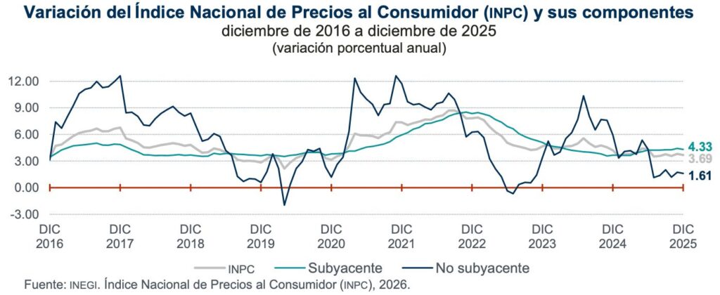 ***La inflación general anual se ubicó en 3.69 por ciento en el último mes de 2025, es decir, permaneció dentro del rango objetivo del Banco de México de 3 por ciento más-menos 1 por ciento