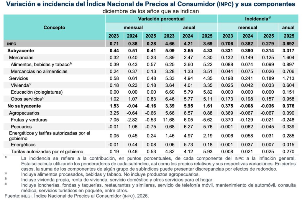 Valle de México, a 8 de enero del 2026.- Los precios al consumidor reportaron un aumento anual de 3.69 por ciento durante el último mes del 2025, 0.52 puntos menos que el 4.21 por ciento que registraron en el mismo mes de 2024 y, 0.11 puntos por debajo del 3.80 por ciento  de noviembre pasado.