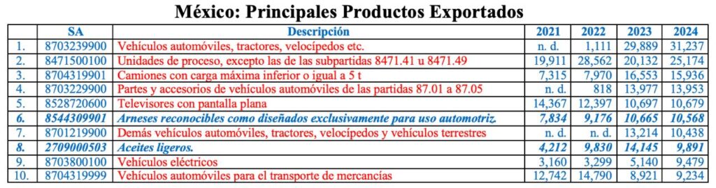 Durante los años 2023 y 2024, de los 40 principales productos de exportación mexicana, un total 29 de ellos se caracterizaron por su alto contenido de insumos extranjeros, con cifras de 209,964 y 221,509 millones US, que correspondieron a 34.73% y 35.90% del gran total de 593,005 y 617,100 millones US, respectivamente.