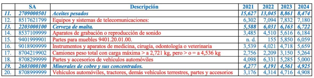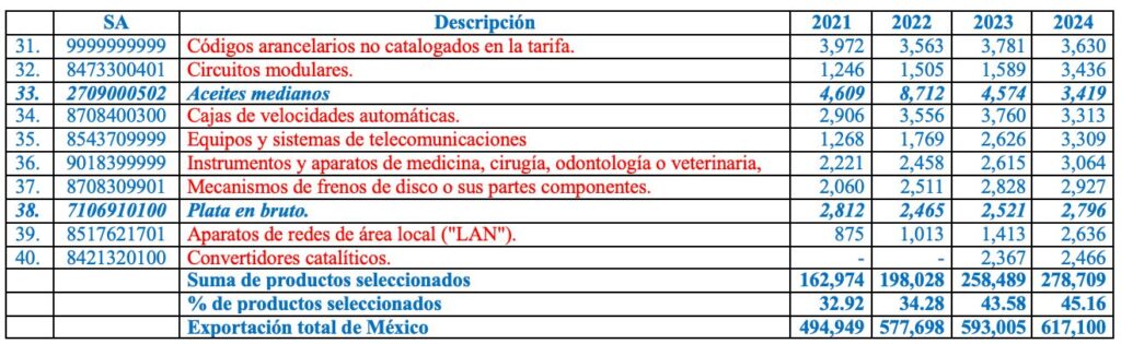 Los siguientes 5 productos incluyen aceites medianos con 0.55%, netamente mexicanos, en tanto que el resto son otro grupo de productos no identificados en la tarifa general de exportación, circuitos modulares, cajas de velocidad automáticas, así como equipos y sistemas de telecomunicaciones, elaborados con alto porcentaje de insumos extranjeros, con 2.23%.