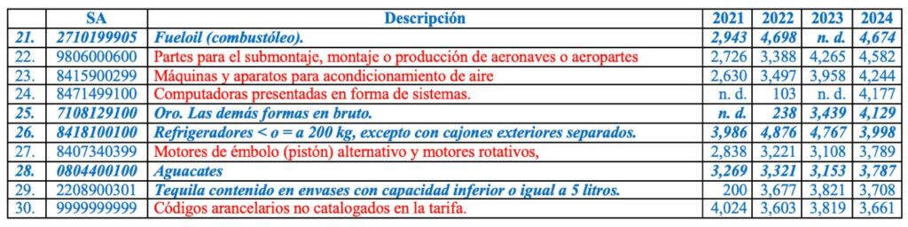 En el quinto grupo figuran el fueloil y el oro en bruto como netamente mexicanos con 1.43%, en tanto que el resto correspondieron a partes para aeronaves; máquinas y aparatos para acondicionamientos de aire; y computadoras en forma de sistemas, con 2.11%.