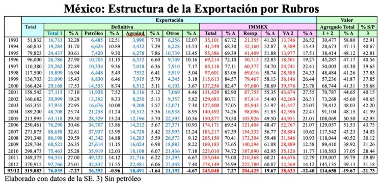 Importante es señalar que, en el año 1993, el valor de contenido nacional en la Exportación Total fue de 58.8% y, excluyendo al petróleo, el porcentaje de sólo 52.91%. Para el año 2012, el porcentaje fue de 39.13% y sin petróleo, se redujo a sólo 31.18%, situación completamente anómala, deprimente y contraria al objetivo propuesto por el TLCAN, A continuación, presento la más reciente información disponible.