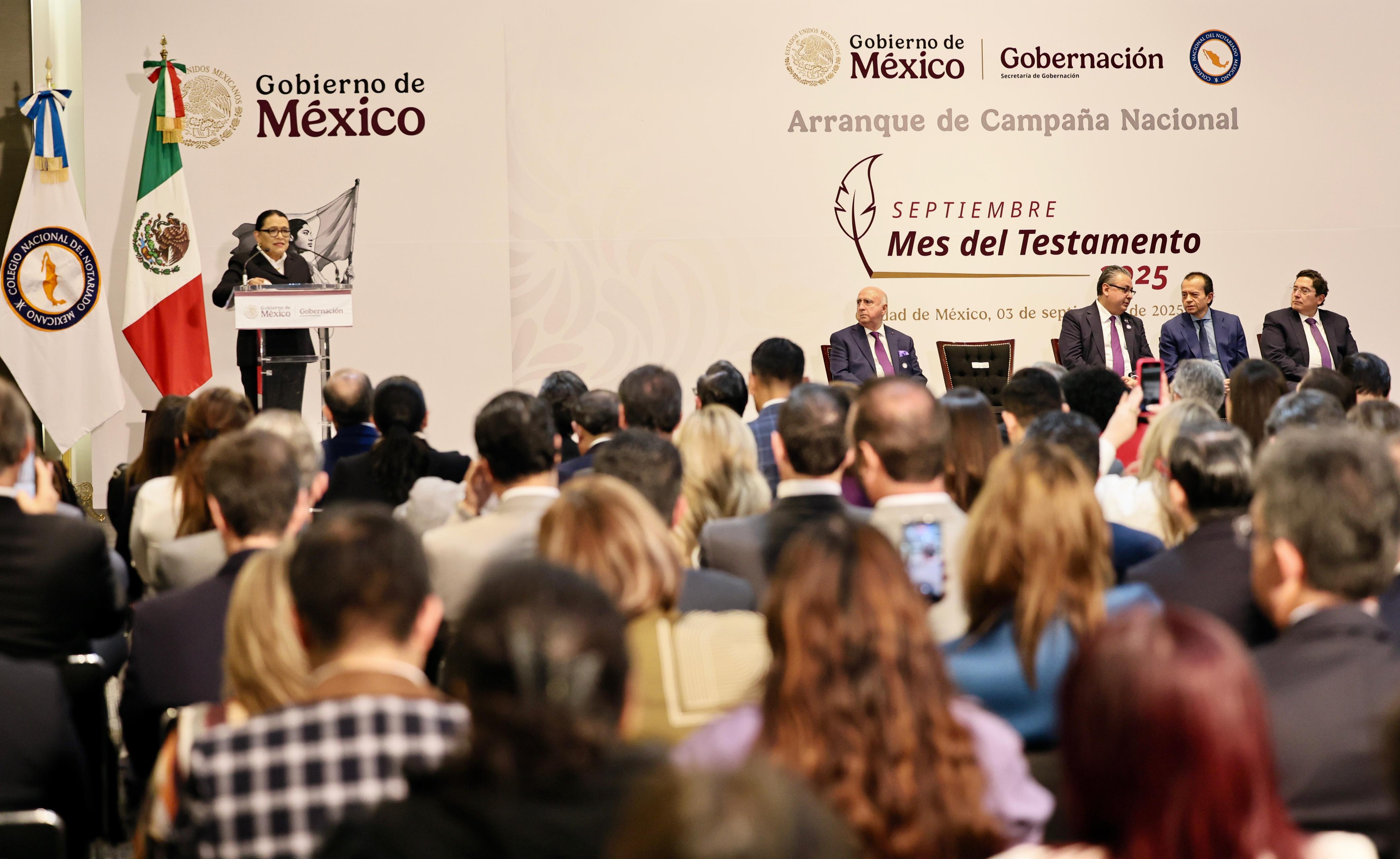 Valle de México, a 3 de septiembre del 2025.- La secretaria de Gobernación, Rosa Icela Rodríguez, invitó a la ciudadanía a participar en la campaña nacional Septiembre, Mes del Testamento, documento que “es el último acto de amor y responsabilidad para heredar tranquilidad y no problemas a los seres queridos”.