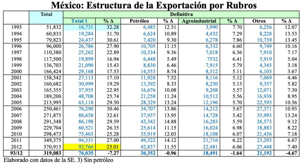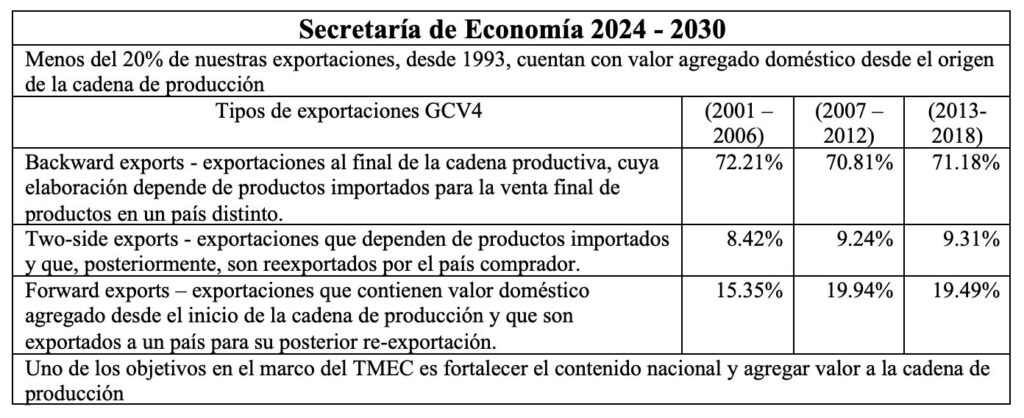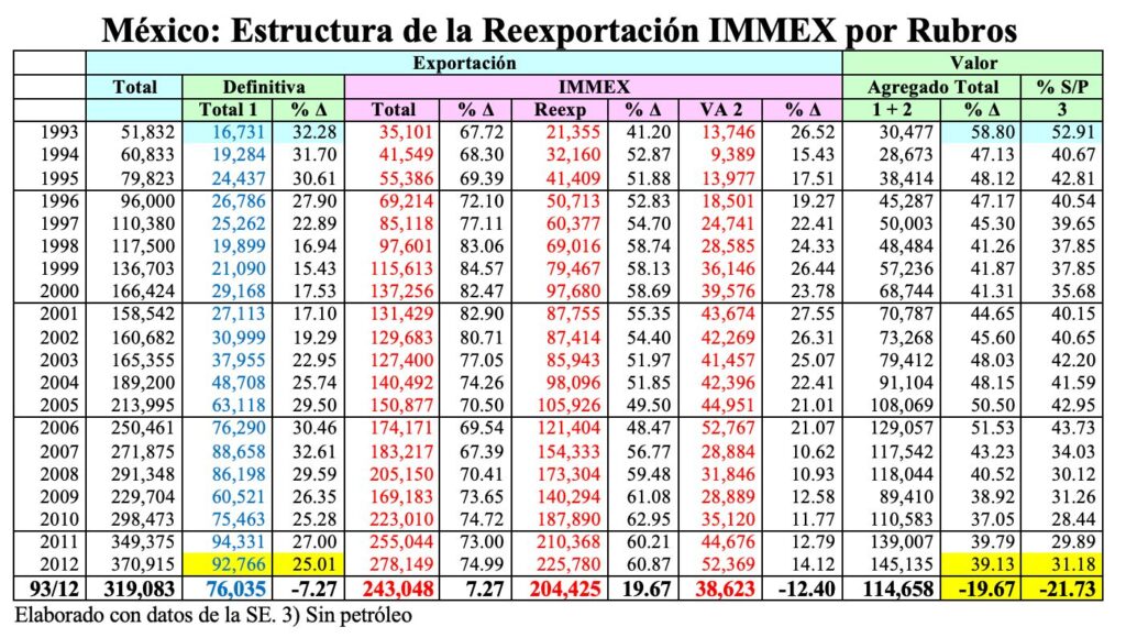 Conviene señalar que a partir de 2007, la SE suspendió la publicación de las estadísticas de comercio exterior desagregadas, sin embargo, pude conseguir las cifras hasta el año 2012, pero, a partir del 2013 ha sido imposible, sin embargo, en la presentación del Programa Secretaría de Economía 2024 2030 se señala mayor deterioro del comercio exterior al mencionar que, Menos del 20% de nuestras exportaciones, desde 1993, cuentan con valor agregado doméstico desde el origen de la cadena de producción, de acuerdo con su cuadro sintético que reproduzco a continuación.