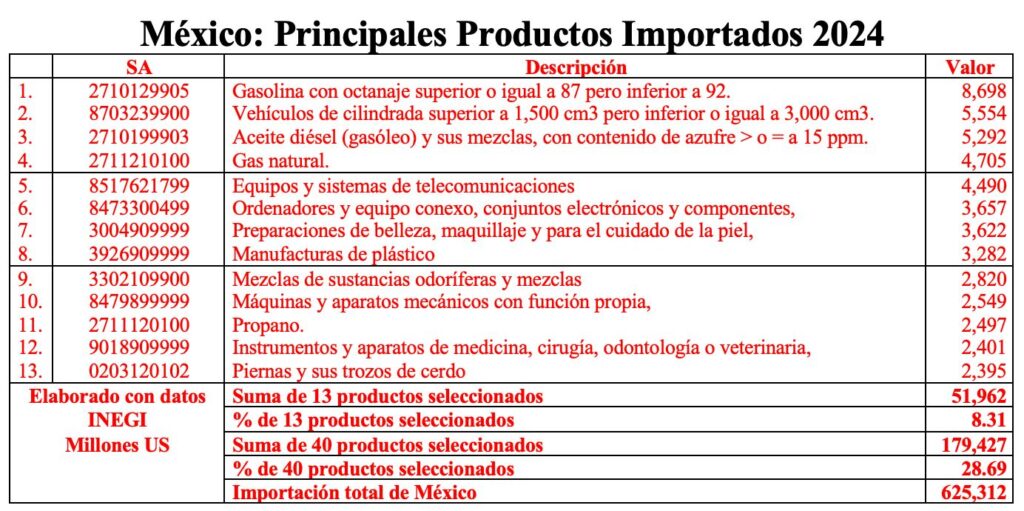 Para ilustrar esta situación, debo señalar que, en el año 2024, el universo de 40 principales productos de importación, se presentan en dos grandes rubros que podemos dividir en productos dirigidos al consumo interno constituidos por 13, con un monto total de 51,962 millones US, correspondiente al 8.31% de la importación total.