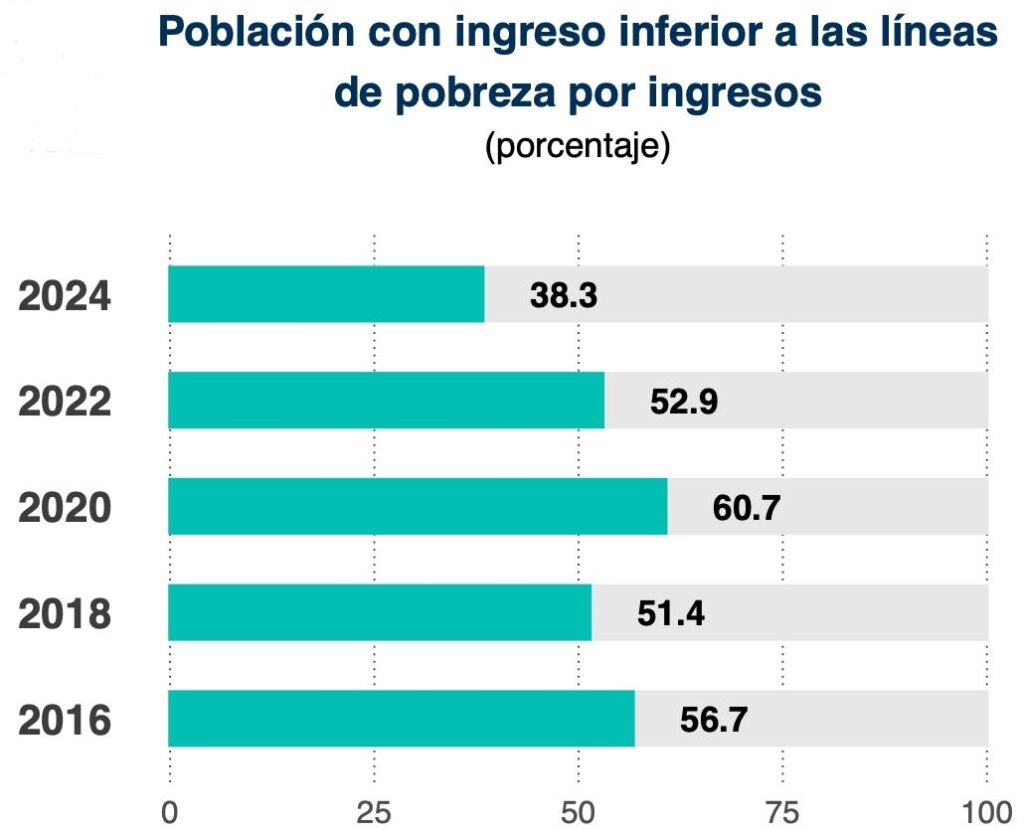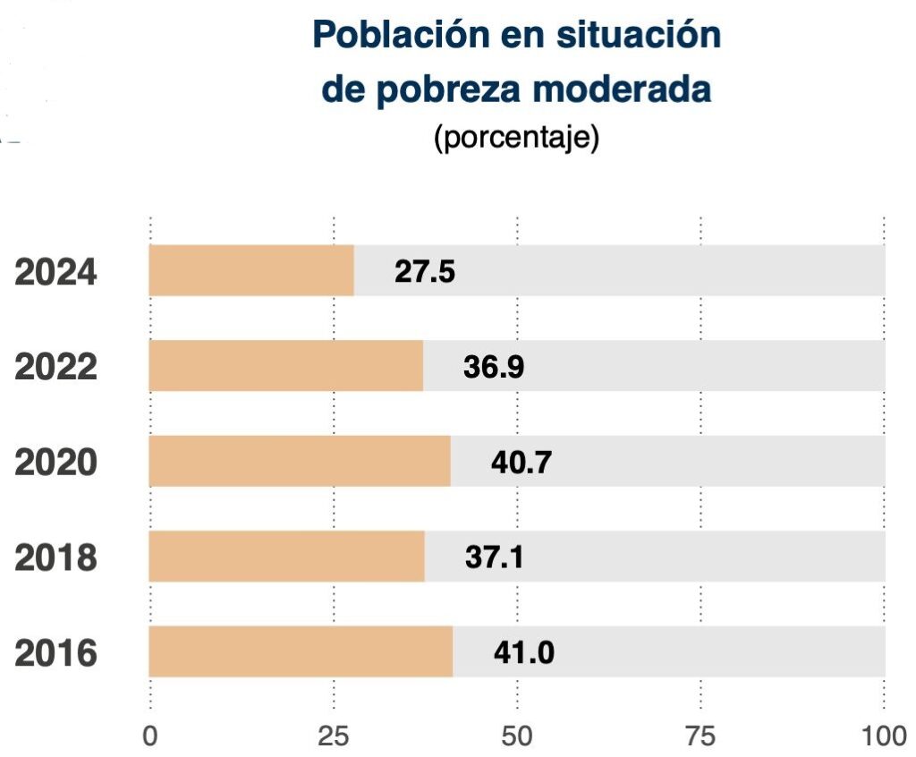Conforme al informe del instituto, en 2024, 29.5 por ciento de la población estaba en condiciones de pobreza, considerando esta condición multidimensional. Fueron 38.5 millones de personas. En comparación con 2018, donde se encontraban en esta condición 51.9 millones, significa que 13.4 millones de personas salieron de la pobreza de 2018 a 2024.