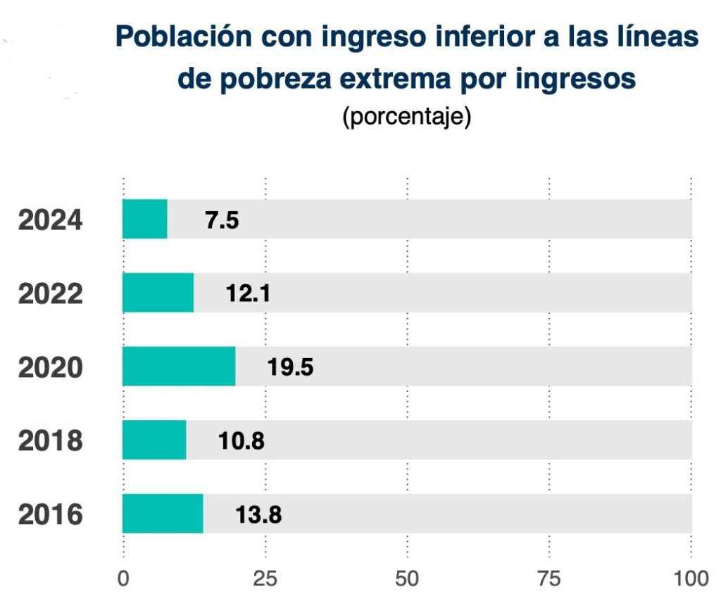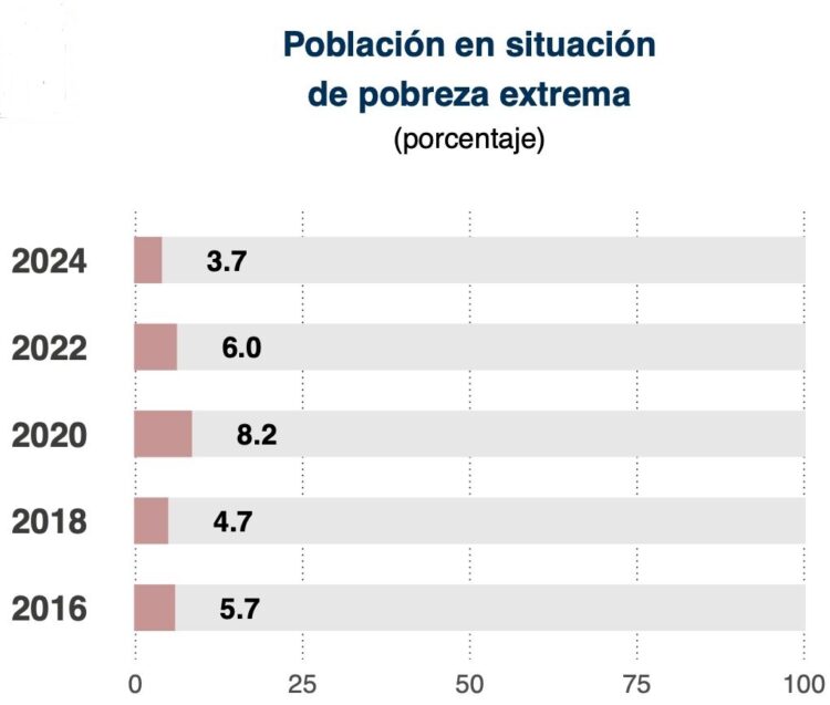 Por otro lado y conforme al reporte del INEGI; la población en situación de pobreza extrema se redujo al pasar de 8.7 millones de personas en 2018 a 7 millones de personas en 2024; en términos relativos también se observó un descenso al pasar de 7 por ciento en 2018 a 5.3 por ciento en 2024.