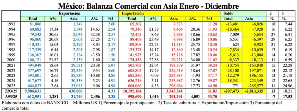 Con este negativo proceso, generado por teorías, dogmatismos y por lo que parece un enorme desconocimiento de la operación real del comercio internacional y de nuestro comercio exterior, que generaron enorme improvisación y mayor simulación, se dio paso a una diversificación tóxica pues, la firma de TLC´s y la desgravación arancelaria unilateral dieron libre acceso a bienes de cualquier origen, principalmente de Asia que, si en 1993, nos suministraba el 11.18% de nuestras importaciones, en 2025 nos suministró el 44.98%, es decir, prácticamente la misma proporción que el T-MEC dejó de proveernos.